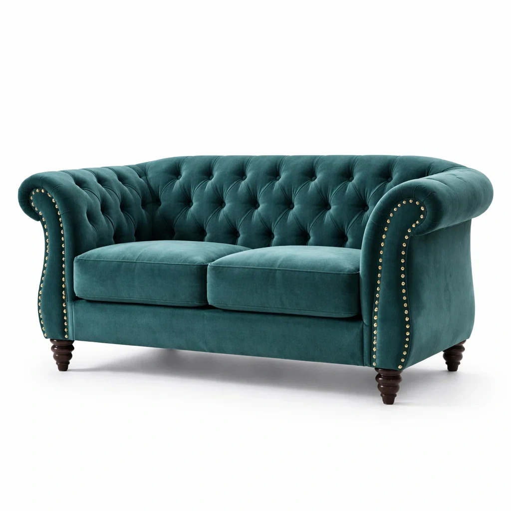 Ce sofa 2 places est revêtu de velours vert émeraude. Sa structure et ses pieds sont en bois, avec des détails décoratifs en clous métalliques. Le sofa mesure 190cm de largeur, 80cm de hauteur et 95cm de profondeur. Les coussins sont remplis de mousse. Les pieds sont de couleur marron.