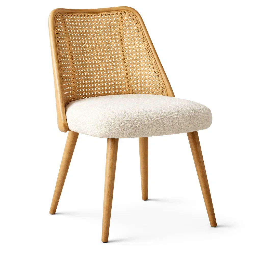 Chaise de salle à manger en bois avec dossier en rotin et assise en tissu crème