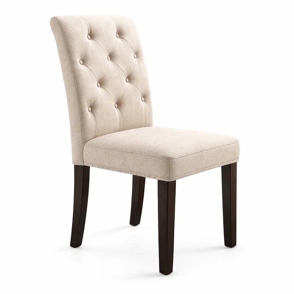 La chaise présente un revêtement en tissu polyester beige, offrant un aspect capitonné sur le dossier. La structure est fabriquée en bois massif, assurant stabilité et durabilité. La chaise mesure 90 cm de hauteur, 45 cm de largeur et 60 cm de profondeur. Elle peut supporter un poids allant jusqu'à 120 kg. Nettoyage avec un chiffon humide recommandé.
