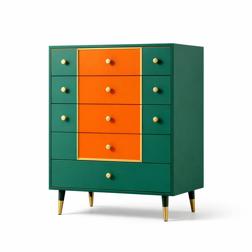 Commode fabriquée en bois MDF avec des poignées en acier inoxydable.