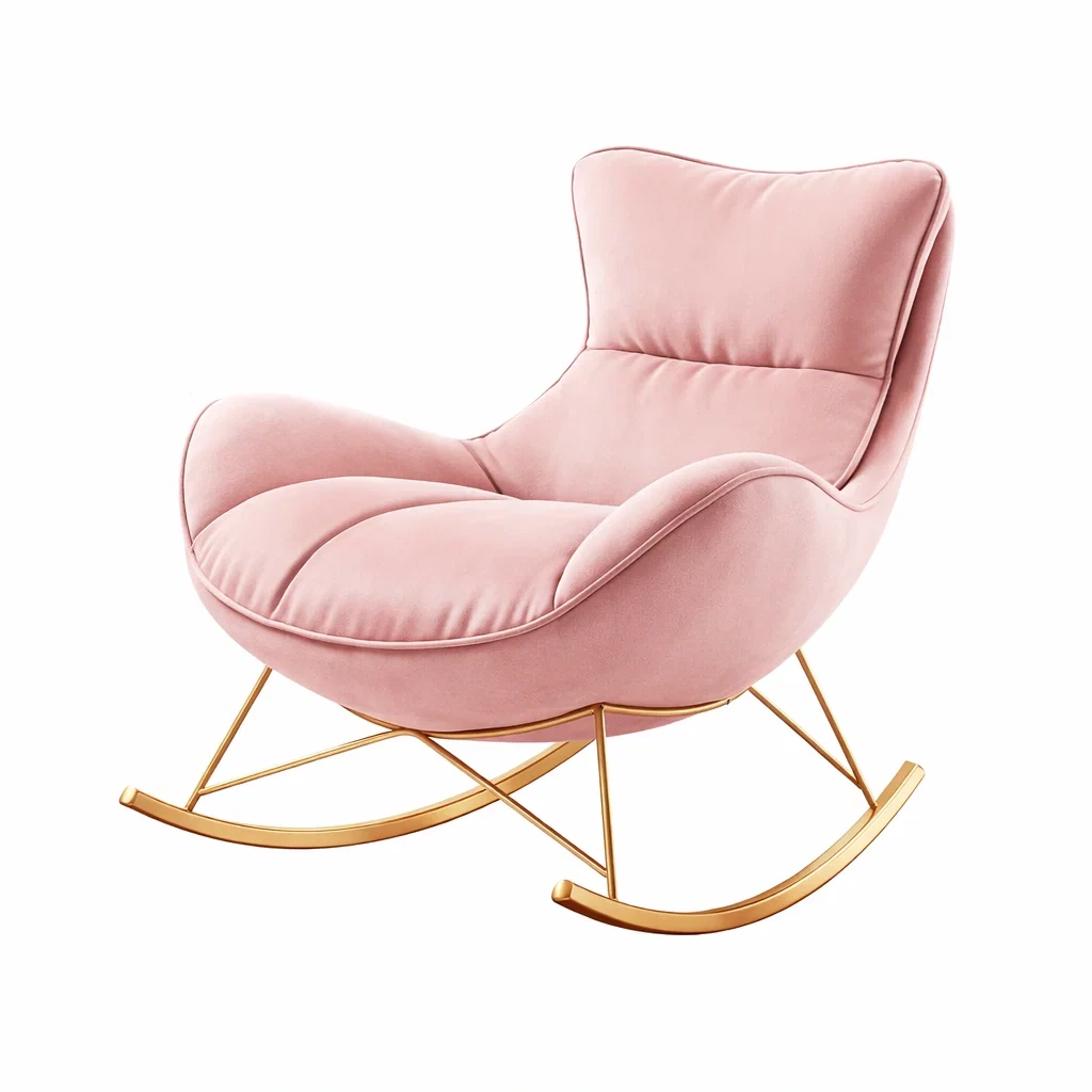 Ce fauteuil à bascule est conçu avec un revêtement en velours rose et un cadre en acier doré. Le fauteuil a des dimensions de 95 cm de longueur, 85 cm de largeur et 70 cm de hauteur. Il pèse 14 kg. La structure en métal assure une solidité et une stabilité adéquates pour un usage quotidien. Le tissu en velours est doux au toucher.
