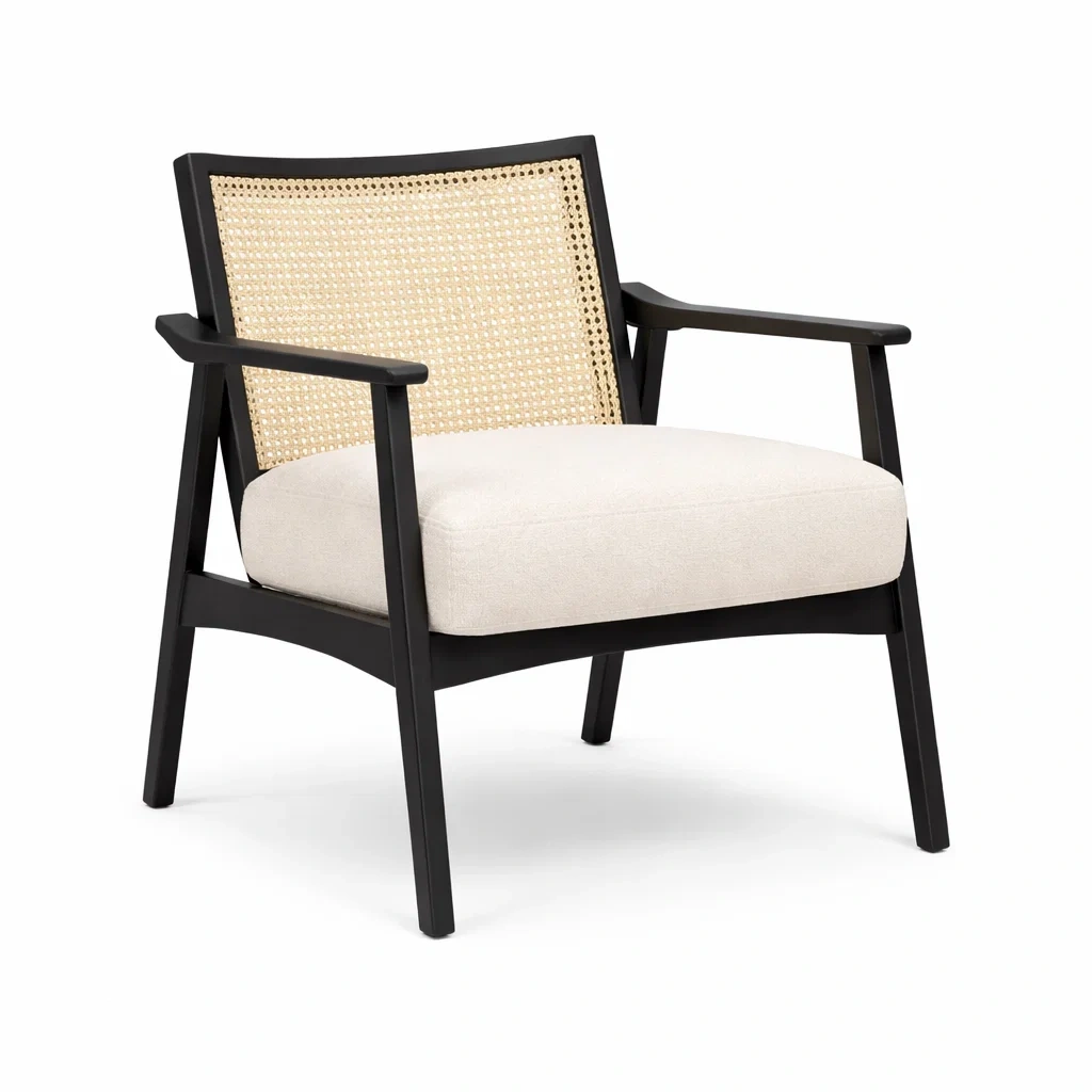 Fauteuil en bois avec dossier en rotin et tissu beige