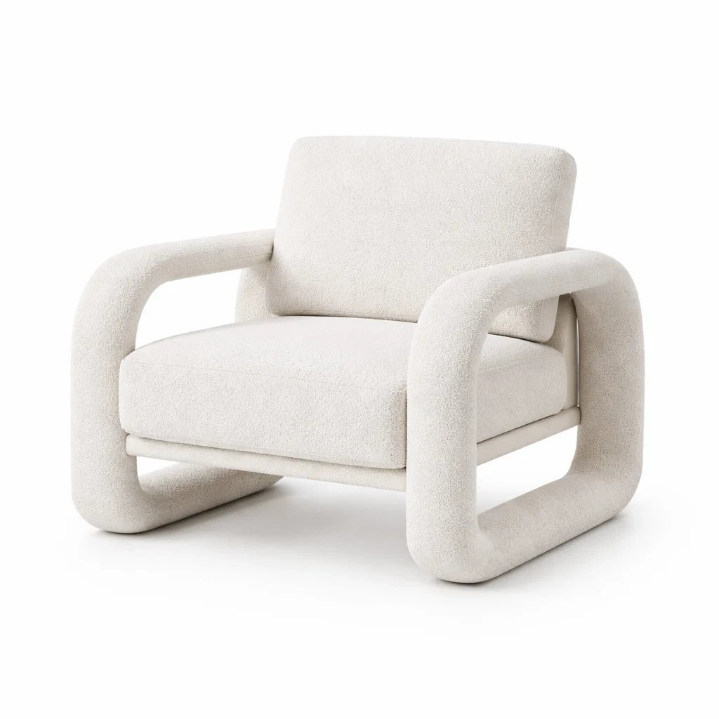 Ce fauteuil est recouvert d'un tissu en polyester blanc sur une structure en contreplaqué. Ses dimensions sont de 80 cm de long, 85 cm de large et 75 cm de haut. Le poids total est de 15 kg.