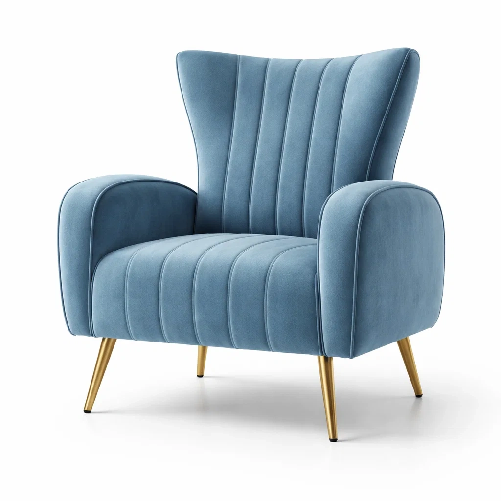 Ce fauteuil est fabriqué en velours bleu avec des pieds en métal doré.