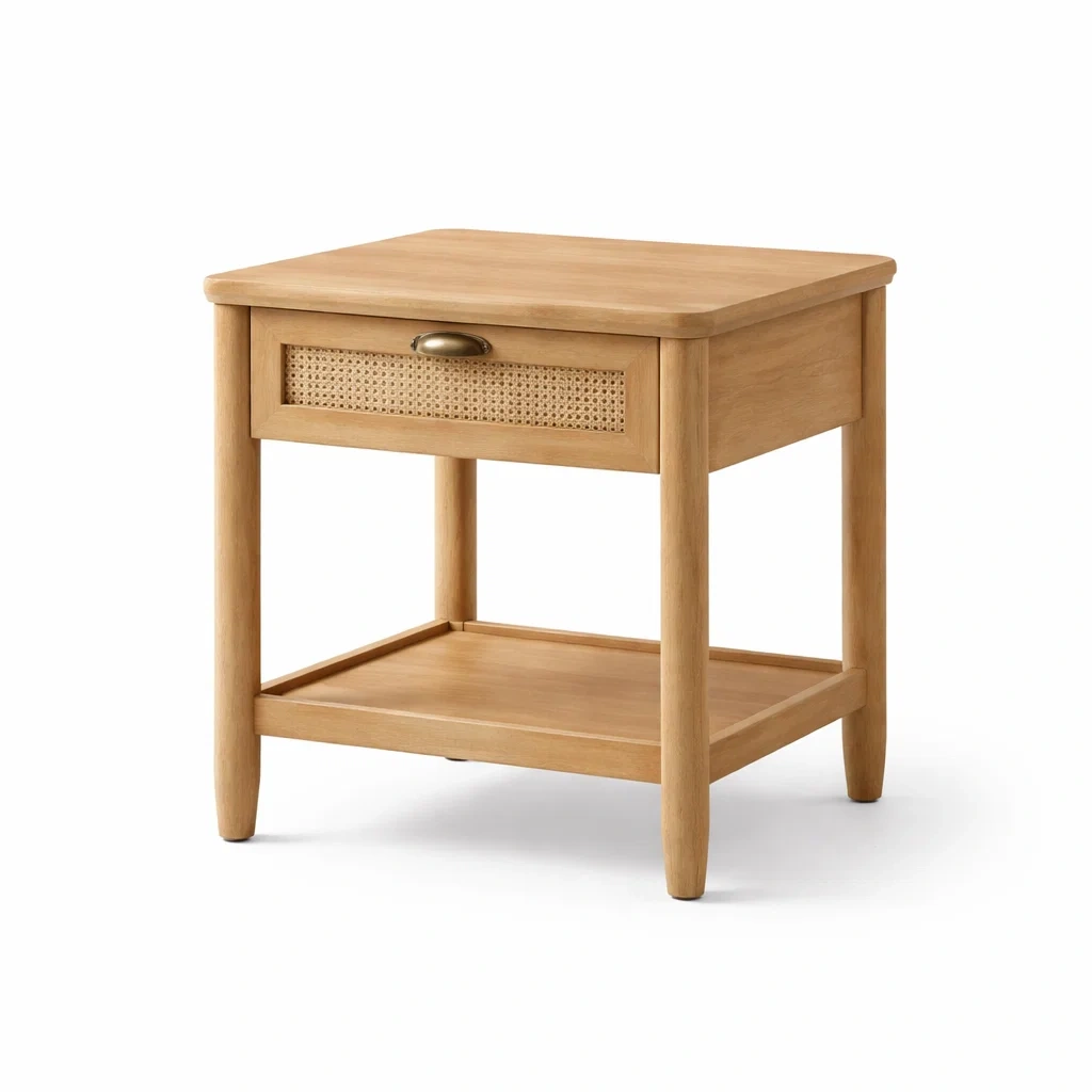 Cette table de chevet est fabriquée à partir de bois de chêne massif, offrant une durabilité et une esthétique naturelle. La surface est recouverte d'un vernis transparent qui préserve la teinte claire du chêne. Elle comprend un tiroir avec une façade en rotin tissé, ajoutant une touche artisanale. Ses dimensions sont de 45 cm de longueur, 40 cm de largeur et 55 cm de hauteur, avec un poids total de 7.50 kg.