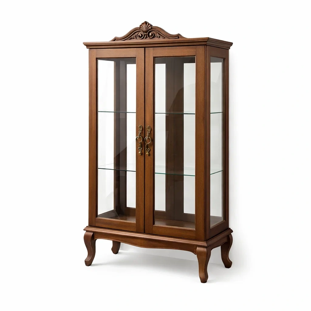Elle possède trois étagères en verre et est équipée de portes vitrées avec des poignées métalliques décoratives.