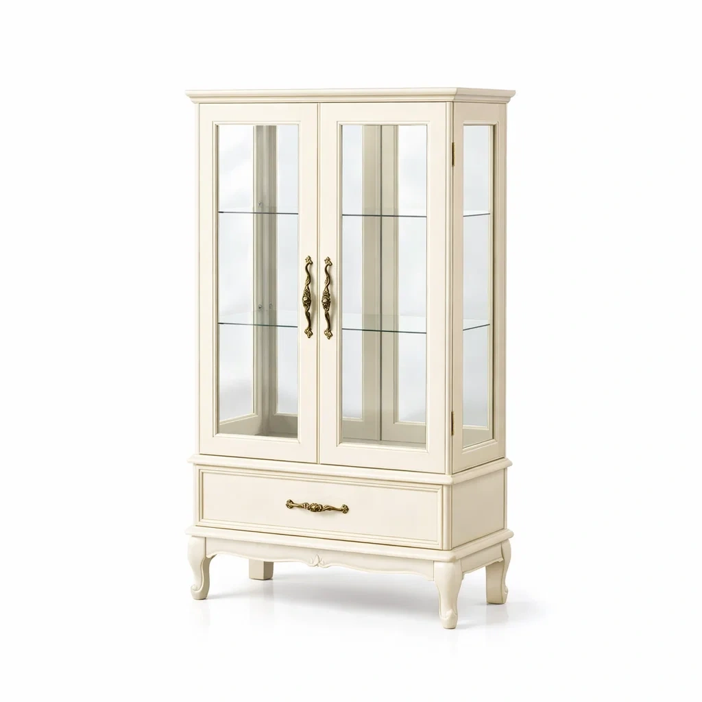 La vitrine est fabriquée en bois avec une finition peinture crème. Les portes sont en verre trempé de 5 mm d'épaisseur, offrant une vue claire sur les objets à l'intérieur. Les poignées sont en métal. La vitrine possède des étagères en verre ajustables pour organiser divers objets. La structure avec pieds incurvés assure la stabilité.