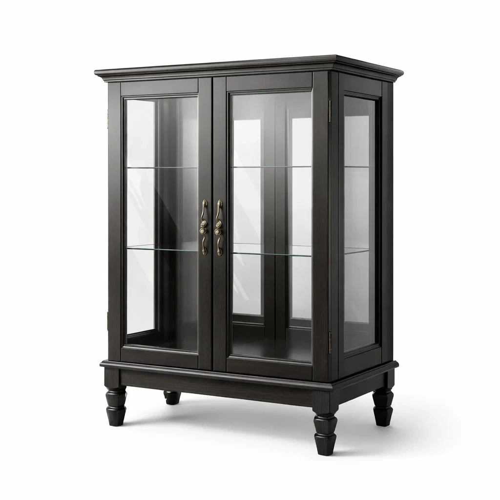 Fonctionnalités : Deux portes vitrées avec étagères en verre pour exposer des objets. Capacité de charge jusqu'à 15 kg par étagère